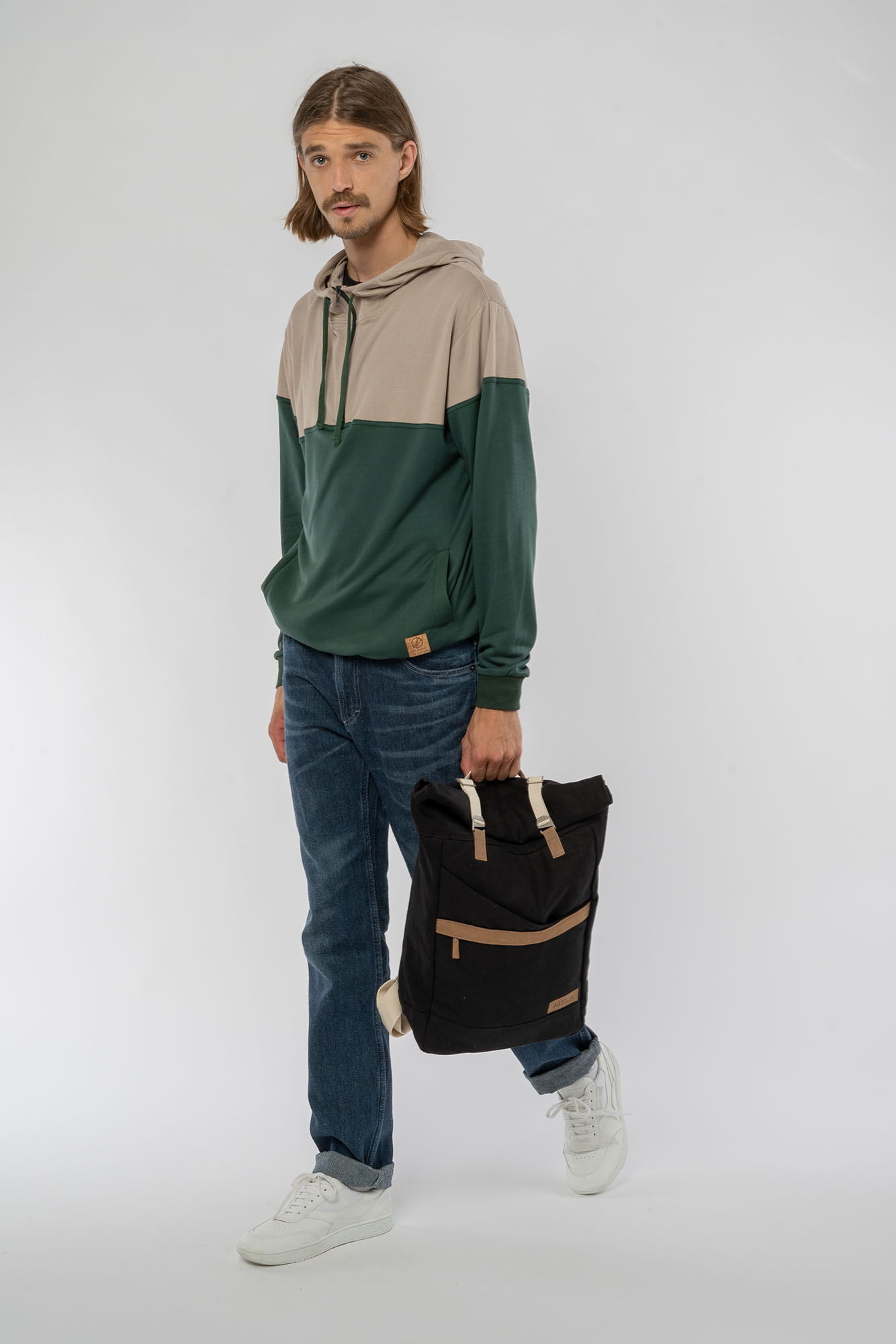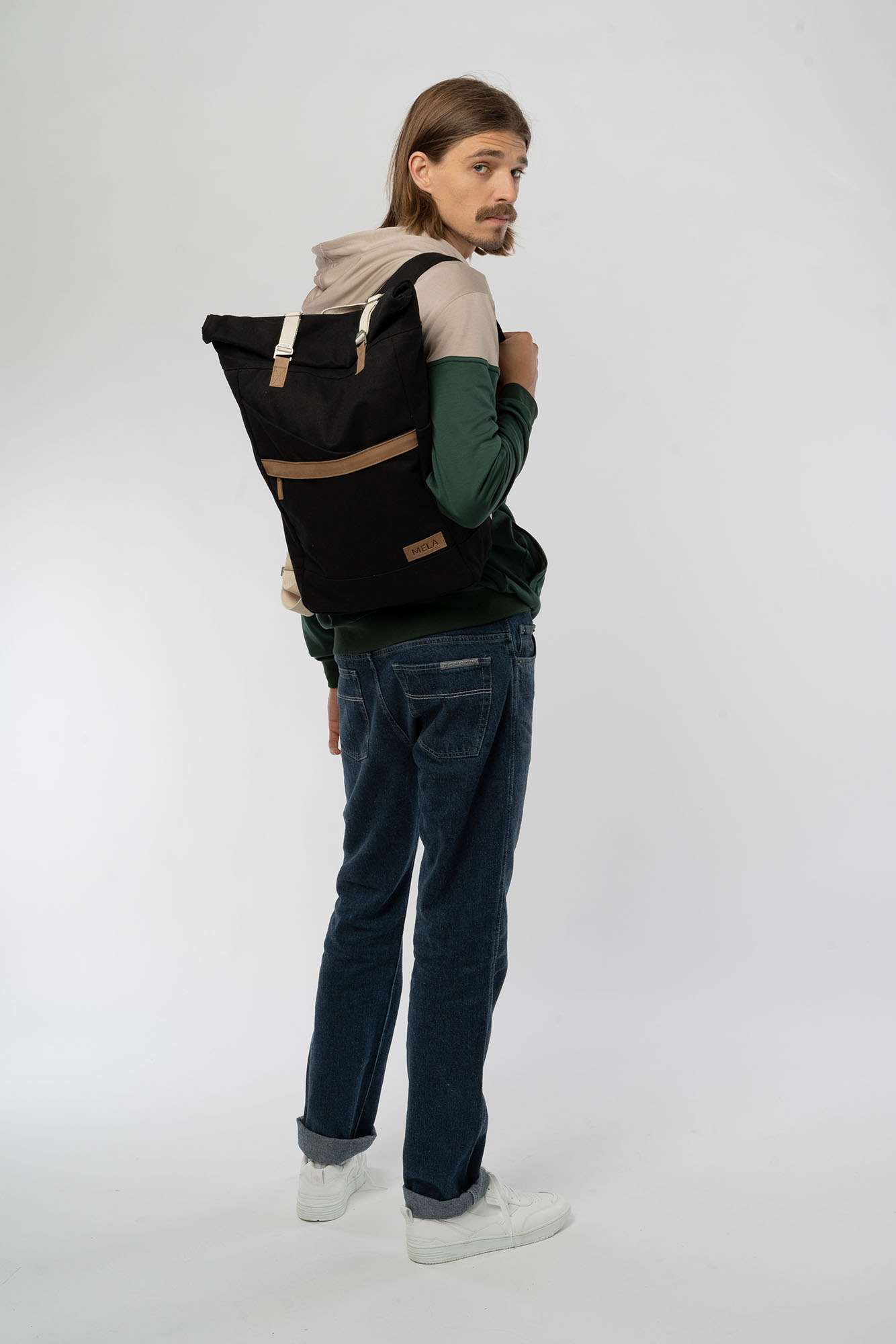 Ansvar ist ausschließlich aus nachhaltigen Materialien hergestellt. Er ist Fairtrade und aus Bio Baumwolle sowie auch Grüner Knopf zertifiziert. Das dichte Biobaumwolle Canvas-Gewebe schützt vor leichtem Regen und ist dabei schnelltrocknend. Durch das Ein- und Ausrollen in seinem Volumen kann der Rucksack variiert werden und ist somit ein idealer Begleiter im Alltag. Durch verschiedene Einflüsse während der Nutzung entsteht mit der Zeit ein einzigartiges, individuelles Produkt. Das Laptopfach erlaubt bis 17" Zoll und ist extra abgetrennt und gepolstert. Eine Zubehörtasche für Kleinteile wie Schlüssel, Handy und Kosmetika ist dabei. Vorne ist ein Zeitschriftenfach für schnellen Zugriff bei optimalem Halt. Das Trinkflaschenfach ist ideal für schmale 0,5 Liter Flaschen. Ein Reißverschlussfach ist dank verdeckter Lederzierblende sicher platziert. Die extra breiten Schultergurte sorgen für großen Komfort während des Tragens und sind ohne lose Bänder gut verstellbar. Volumen: 14 + 5 Liter / Höhe: 40 - 56 cm / Breite: 28 cm / Tiefe: 12 cm / Gewicht: 900 g.