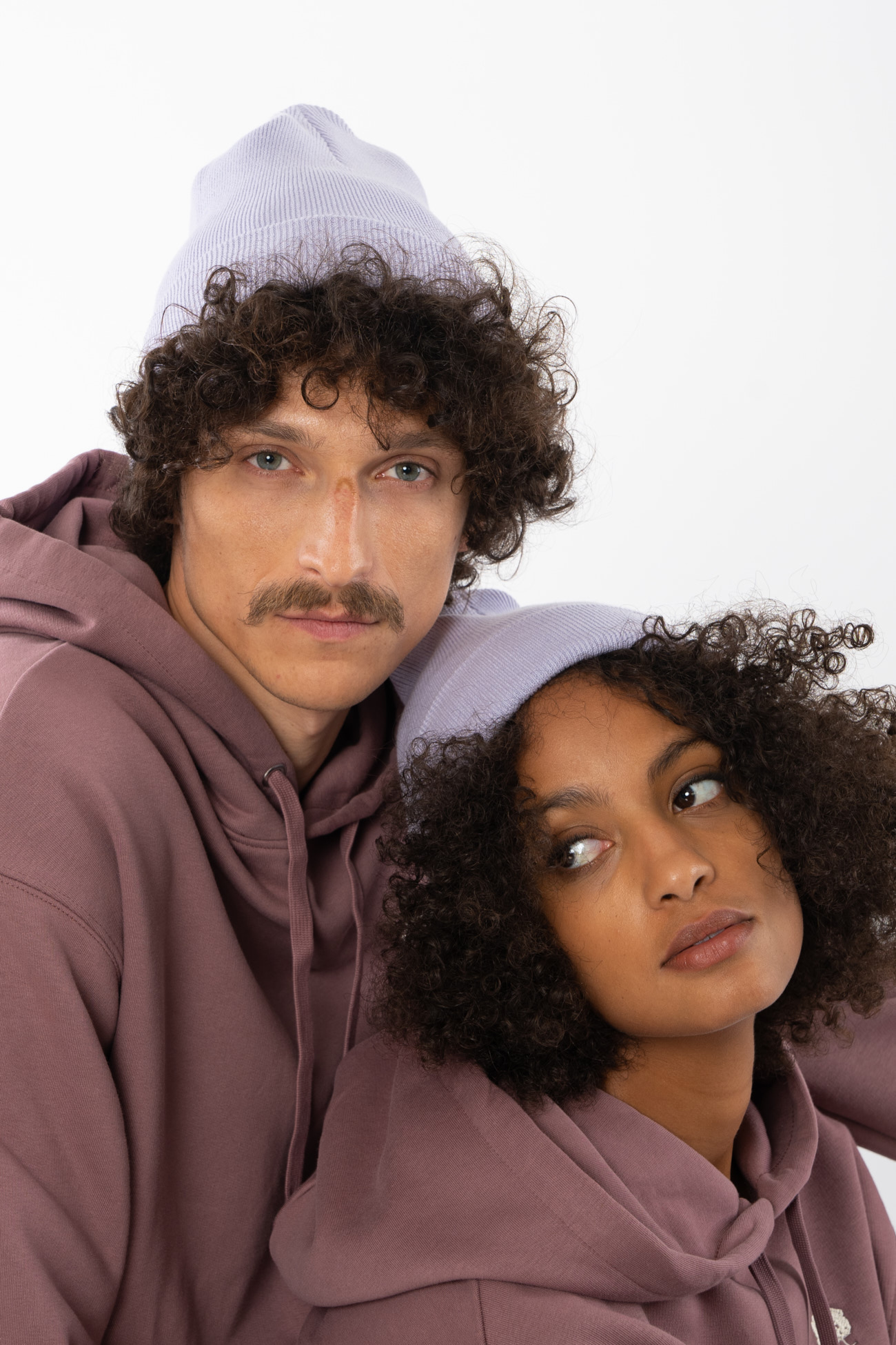 VOYES classic rib beanie. Optimal protection against the cold from autumn to spring. Made with recycled polyester, this beanie will stay with you for a long time. Sarah is 175cm tall and wears size One Size, Mael is 188cm tall and wears size One Size.